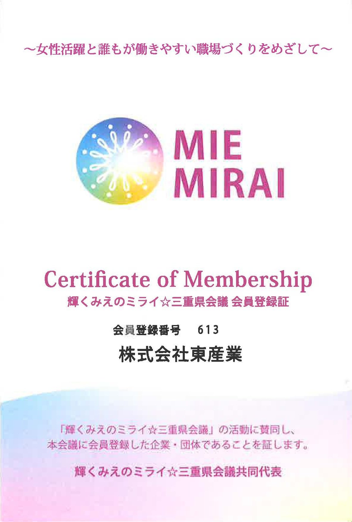 三重県が推進する「輝くみえのミライ☆三重県会議」に登録し、地域と連携しながら、誰もが自分らしく輝ける社会の実現に取り組んでいます。
