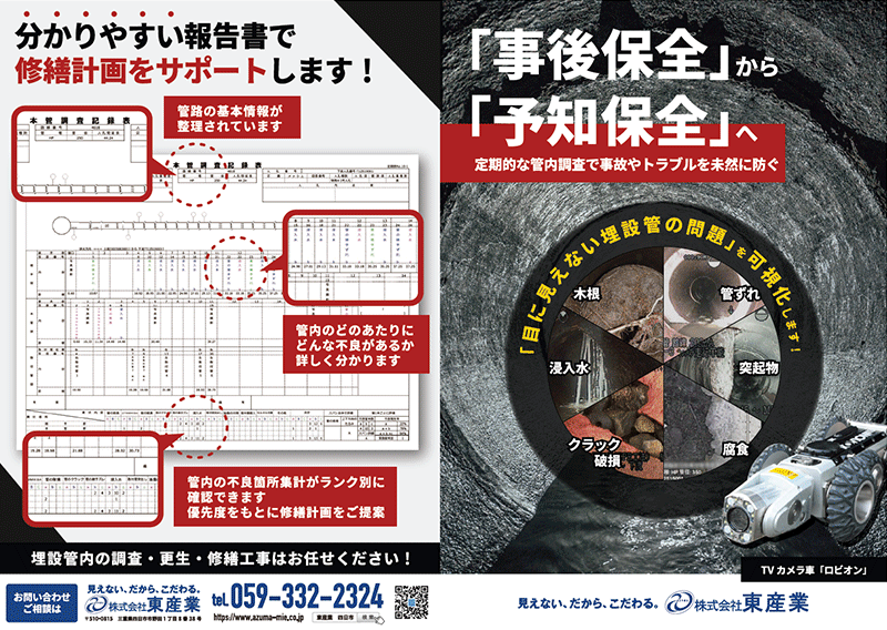 下水管から排水管まであらゆる埋設管に対応した 調査カメラを紹介しています。 埋設管の劣化を可視化することで下水管や 取付け管内の状態を把握し、地盤沈下や 管内トラブルなどの予防保全に役立ちます。